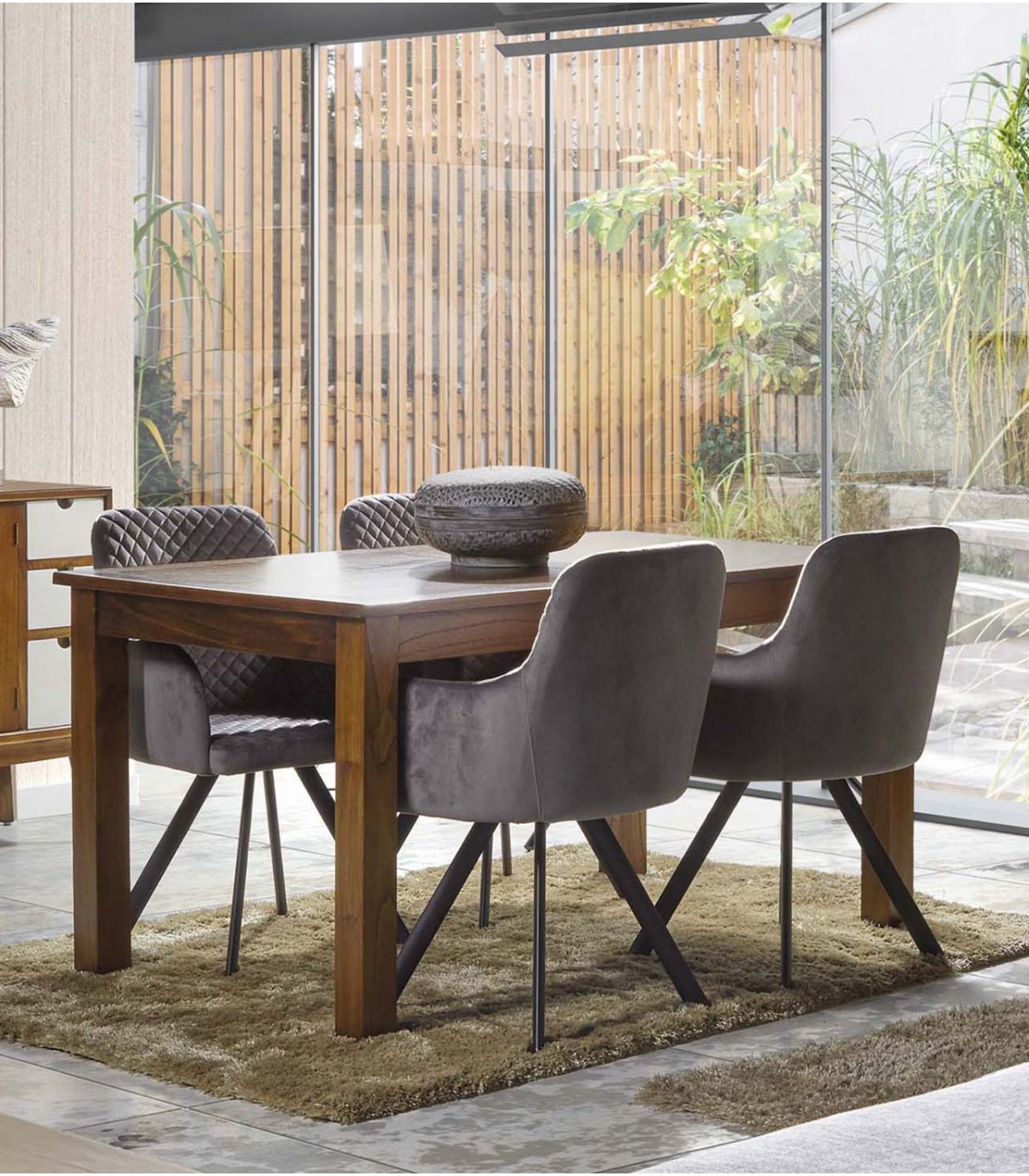 Mesa de comedor STAR de madera maciza de mindi, realizada a mano y terminada con un proceso artesanal. Dispone de 2 cajones con tiradores en acabado bronce envejecido. Medidas: Ancho 150 x Alto 78 x Hondo 85m....